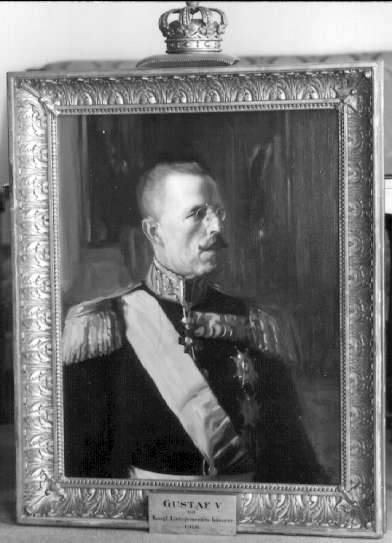 Oljemålning av Gustaf V. Text fram: Gustaf V till kungl livregementets husarer 1918.