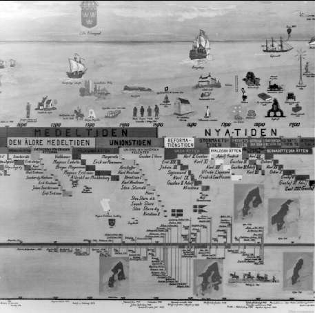 Förminskning av en illustration visande de olika tidsepokerna och deras regenter, samt olika krig och fältslag. Ursprunget okänt.
