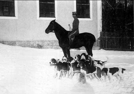 Adjutanten, tillika master vid jakterna, med ridskolans "Meute" (jakthundarna). Strömsholm 1910-11.