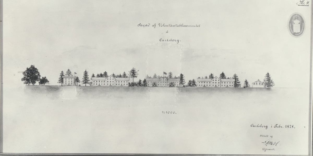 Infanterivolontärskolan , senare rekrytskolan för infanteriets officers-och reservofficersaspiranter. 1878. Från vänster:Befälsbyggnaden, Östra kasern, Mittenkasern och framför denna två minder byggnader-den vänstra arrestlokal och den högra vaktlokal, Västra kasernen, gymnastik-och exercishuset.