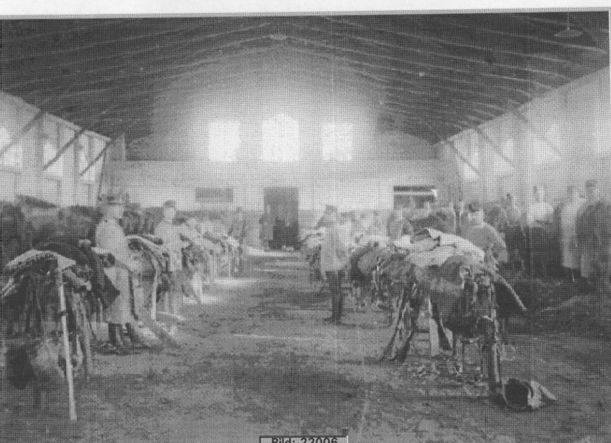 K3. Provisoriskt ordnat stall, utan bås osv med hästar och husarer uppställda utmed väggarna, c:a 1907. Johan Verner Löfkvist född 27/8 1888. F d stamanställd på k3, far till Rune Löfkvist.