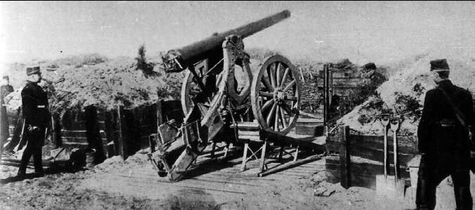 Första skottet vid skarpskjutning på Marma år 1903 med 12 cm kanonbatteri m/1885 med rekylkilar.