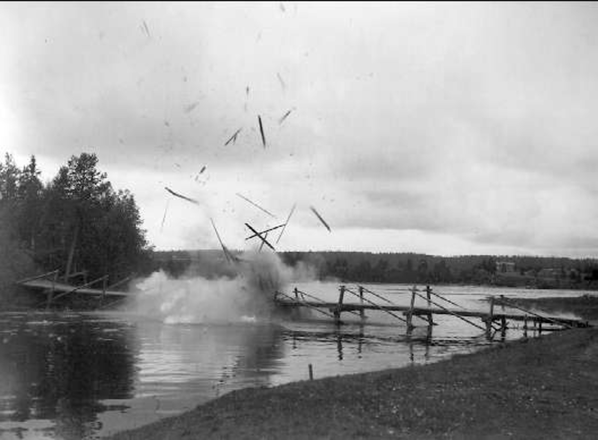Del av bron sprängs bort, Boden omkring år 1900. Objektkommentar: Ingår i en serie bilder som visar hur en mindre bro först snvändes sedan delvis sprängts och verkan av sprängningen.Senare än år 1900.Det är en ingengörtrupp som utför sprängningen och sådant förband började utbildas först 1902 (i Notviken intill Norrbottens regementes övningsplats).