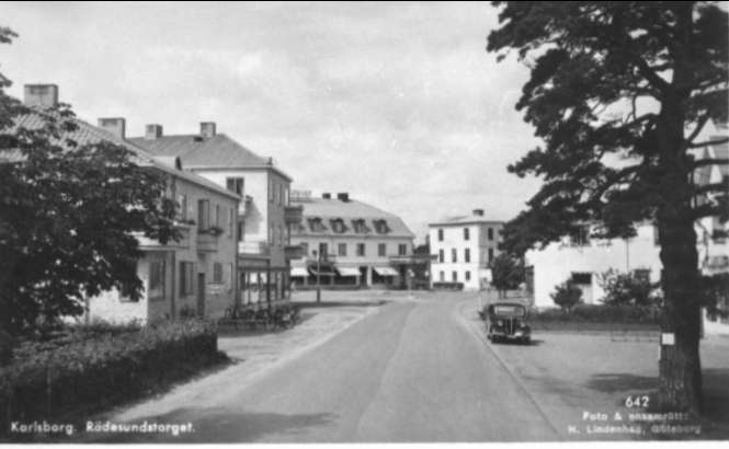Karlsborg, Strandvägen. Kortet är taget omkr 1950. Centrumhuset till vänster var färdigbyggt år 1946. Endast neg finns.