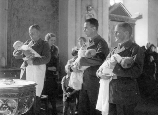 Krigsbarndop i Falköping 1940. Barnens fäder var inkallade, varför militärer på plats fick bära fram barnen.