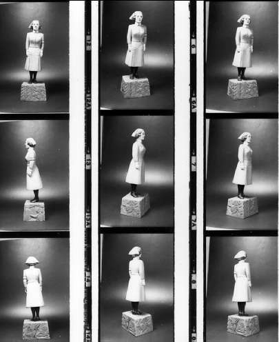 Titel: Trästatyett av en lotta, från utställningen "Landstormskvinna i går, lotta i dag". Neg finns.