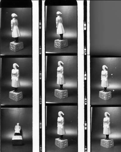Trästatyett av en lotta, från utställningen "Landstormskvinna i går, lotta i dag". Neg finns.