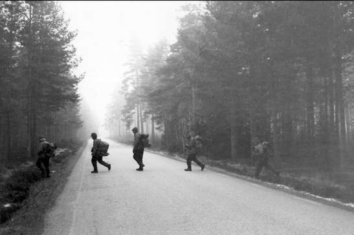 Signalregementet S 2, verksamhetsår 1984.Signalsoldaterna genomför gruppvis vecka "fria kriget", handledare ur Fallskärmsjägarskolan.