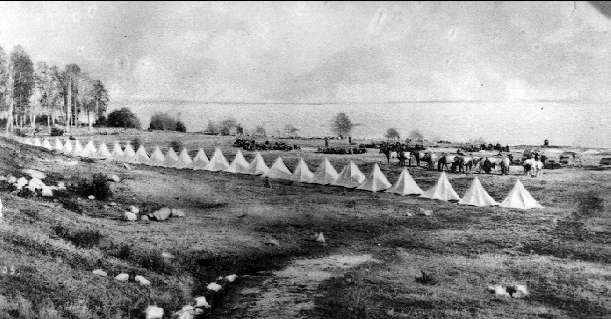 Trängen, bivackläger med hästar vid en sjö, omkr år 1900. Förstoring 20 x 40 cm. Neg finns.