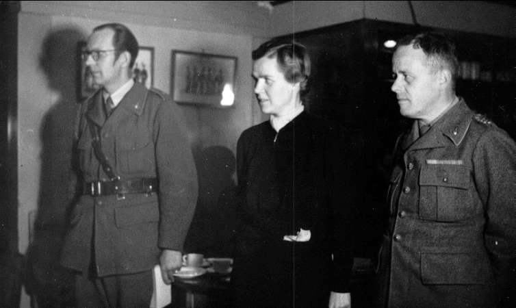 Fästningen, öv Einar Hellström med fru och depåass. Pos Borg på marketenteriet, i samband med "Krigsstigen" 30/11 1942. Förstoring 20 x 30 cm finns.