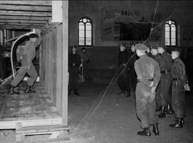 Karlsborg FJS. Fallskärmsjägare i träningshallen, år 1956.