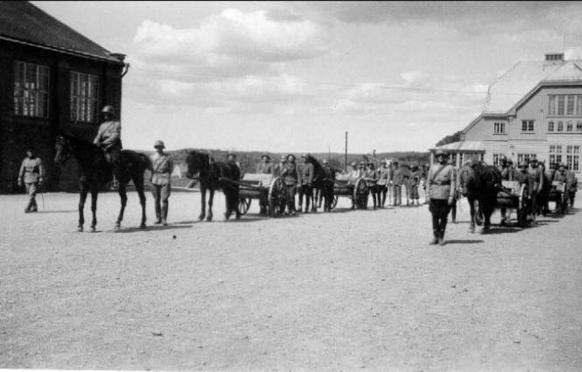 Militärer i fält med hästanspända vagnar. Kornett Johansson och väbel Bresky.