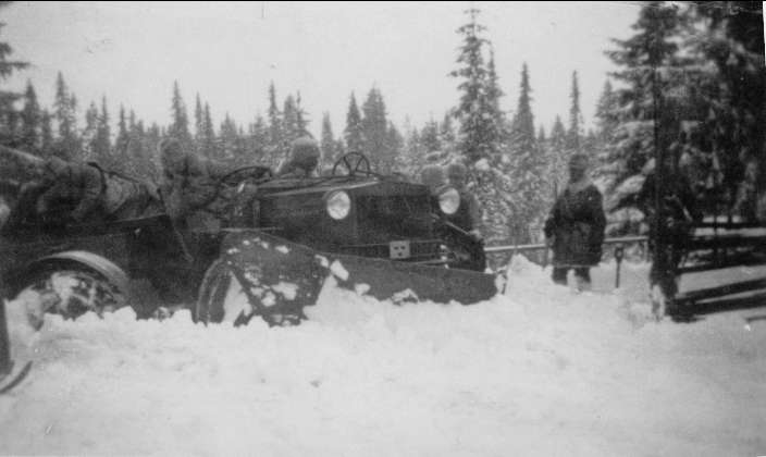 Snöplogning med artilleritraktor m/28 vid Lidberg Malung, Dalarna, febr 1934. A 9 furirskola och volontärartilleriskola på vinterövning. Fotot är en gåva av Tage Södergren.