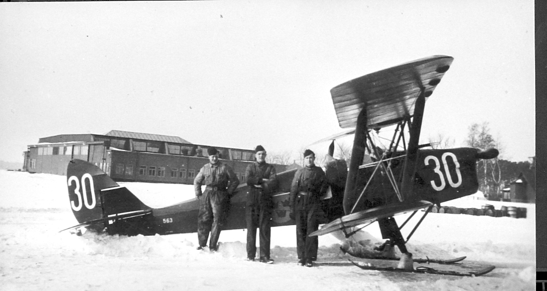 F6 Karlsborg omkring 1941. SK11 De Havilland Tiger Moth. I bakgrunden tygverkstaden som blev Flygverkstaden den 15/5 1944. Albumet är en del av en donation från Karl-Axel Hansson, Karlsborg. Förteckning över hela donationen finns i albumet samt som Word-dokument.