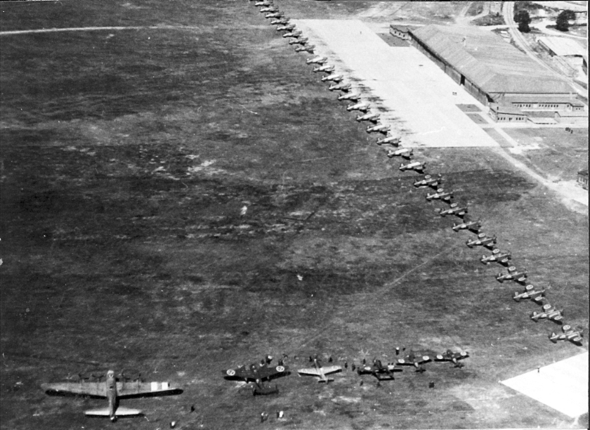 F6 Karlsborg 1945. Flygets dag. Flottiljens lätta bombplan B17 på linje, samt gästande flygplan. Från vänster B17 (amerikansk), B18A, J26 Mustang, J21, Samt 2 J22. Albumet är en del av en donation från Karl-Axel Hansson, Karlsborg. Förteckning över hela donationen finns i albumet samt som Word-dokument.