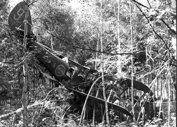 F6 Karlsborg 1947. Bogserplanet efter nödlandning småbjörkarna och stängslet vid dåvarande underofficersbostaden nära Åsen. Albumet är en del av en donation från Karl-Axel Hansson, Karlsborg. Förteckning över hela donationen finns i albumet samt som Word-dokument.