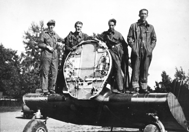 F6 Karlsborg 1942. Nedmonterad B5:a för transport på järnväg. Från vänster: Montörerna Lindman, Hansson, Johansson och snickaren Frisk. Albumet är en del av en donation från Karl-Axel Hansson, Karlsborg. Förteckning över hela donationen finns i albumet samt som Word-dokument.