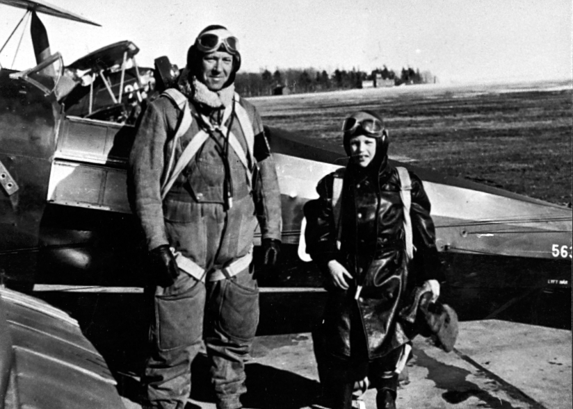 F6 Karlsborg 1941. F6-flottiljens första chef, Överstelöjtnant John Stenbeck med son, efter en flygtur med flygplanet SK11, De Havilland Tiger Moth. Albumet är en del av en donation från Karl-Axel Hansson, Karlsborg. Förteckning över hela donationen finns i albumet samt som Word-dokument.