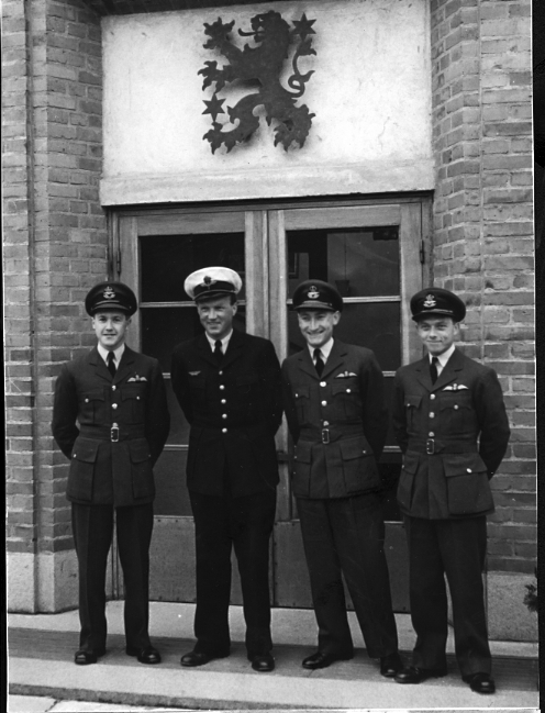 F6 Karlsborg 1954. Divisionschefen kapten Sven Alm (vit uniformsmössa) omgiven av 3 officerare ur Royal Air Force 94 squadronen. Bilden tagen vid ingången till matsalen. Albumet är en del av en donation från Karl-Axel Hansson, Karlsborg. Förteckning över hela donationen finns i albumet samt som Word-dokument.