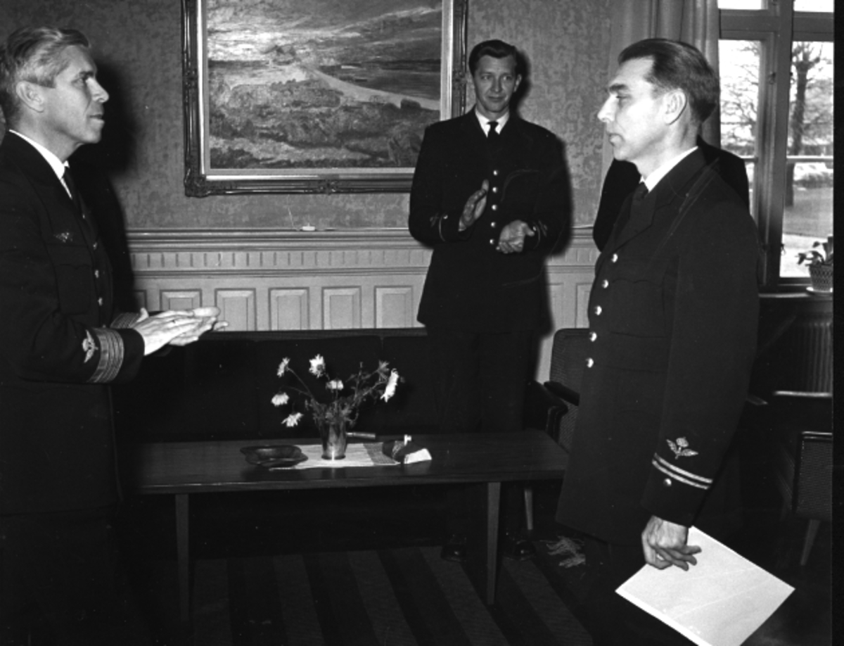 F6 Karlsborg 1959. Underofficersmässen. Överlämnande av svärdsorden till fanjunkare Larsson. Från vänster: Chefen F6 överste Söderlindh, sergeant Nilsson, fanjunkare Larsson.