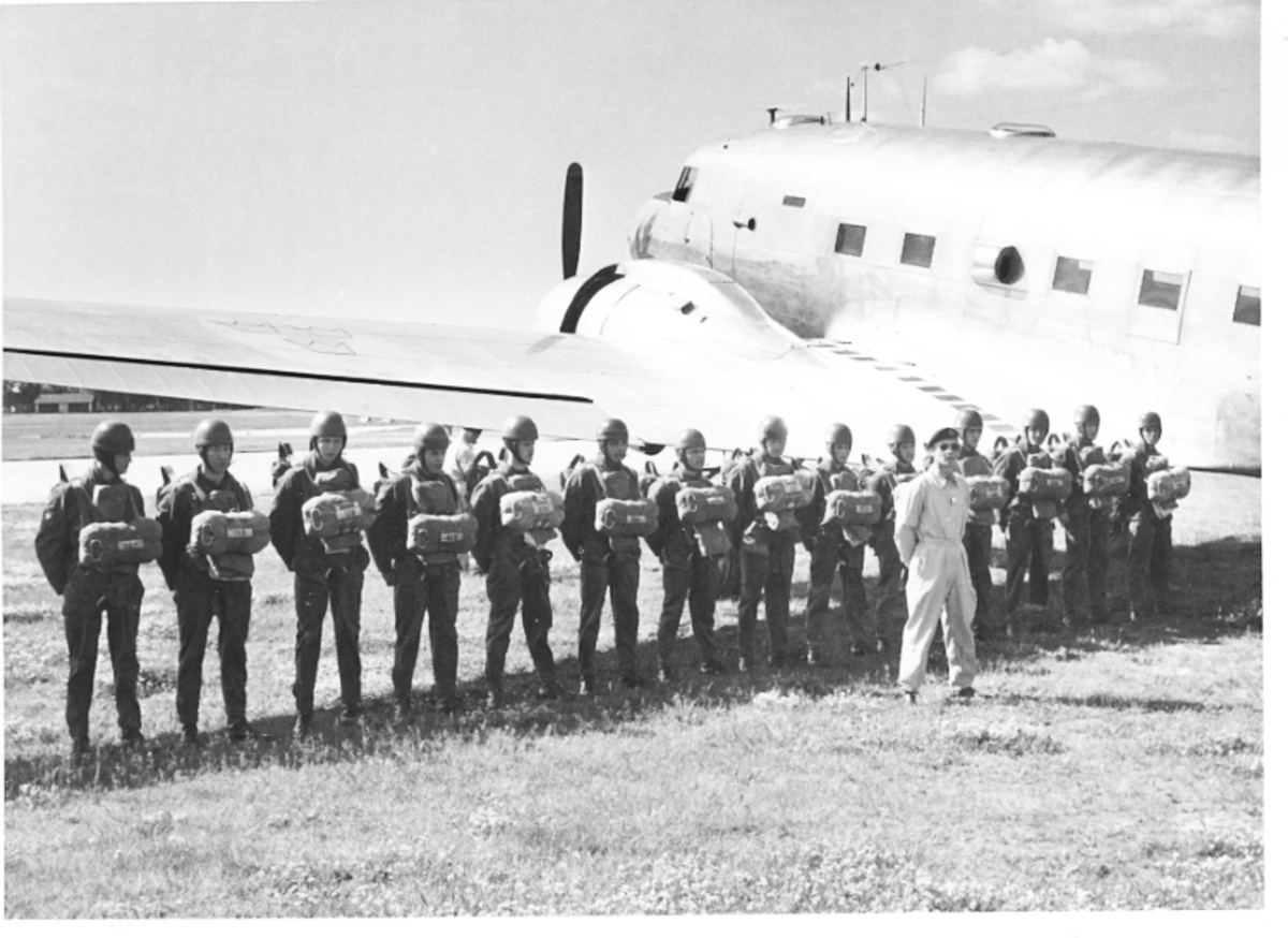 Titel: Fallskärmsjägarskolan Karlsborg i början av 1960-tal. Förberedelser inför fallskärmshoppning.
