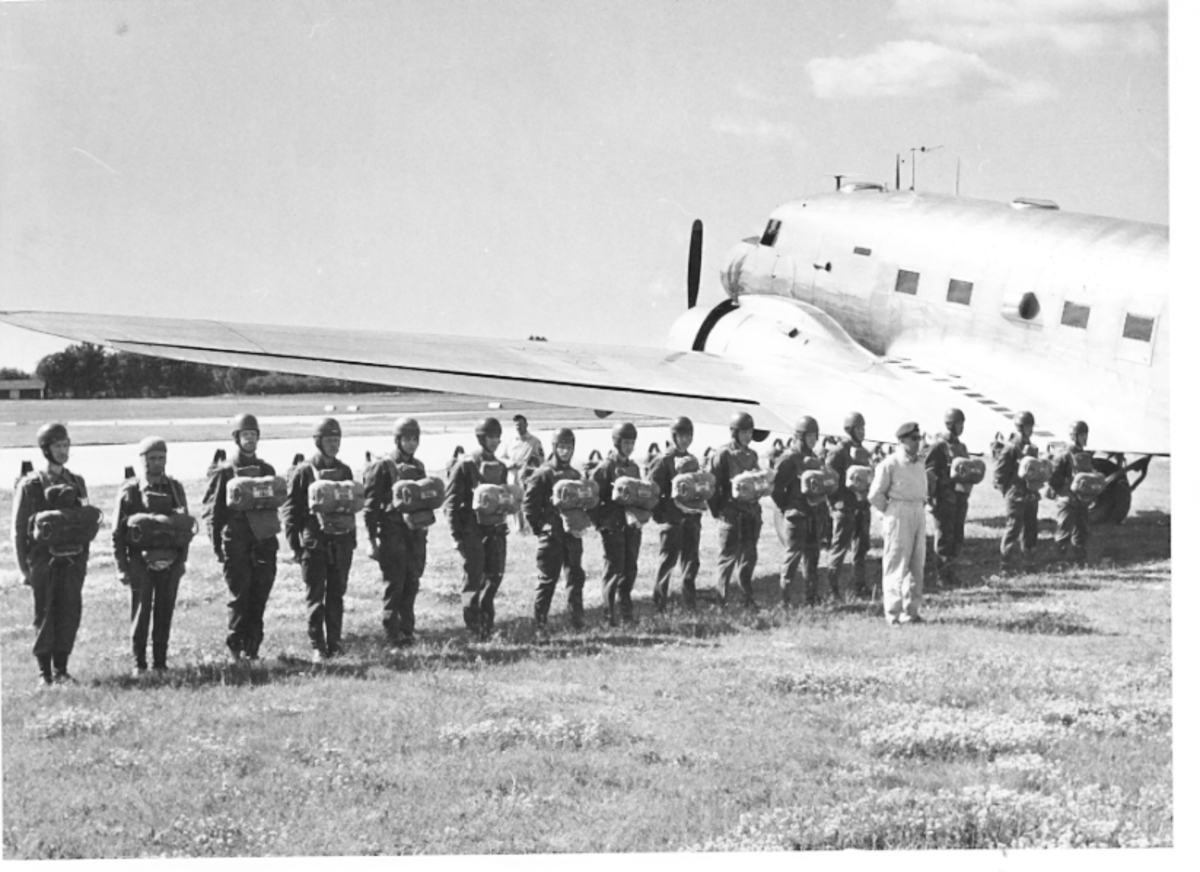 Fallskärmsjägarskolan Karlsborg i början av 1960-tal. Förberedelser inför fallskärmshoppning.
