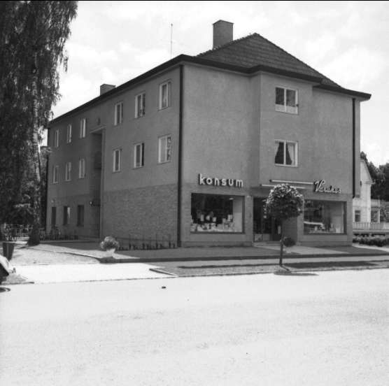 Varuhus - Konsum, på Kungsgatan, Karlsborg, med bl.a. sortiment som textil och porslin. Endast neg finns.
