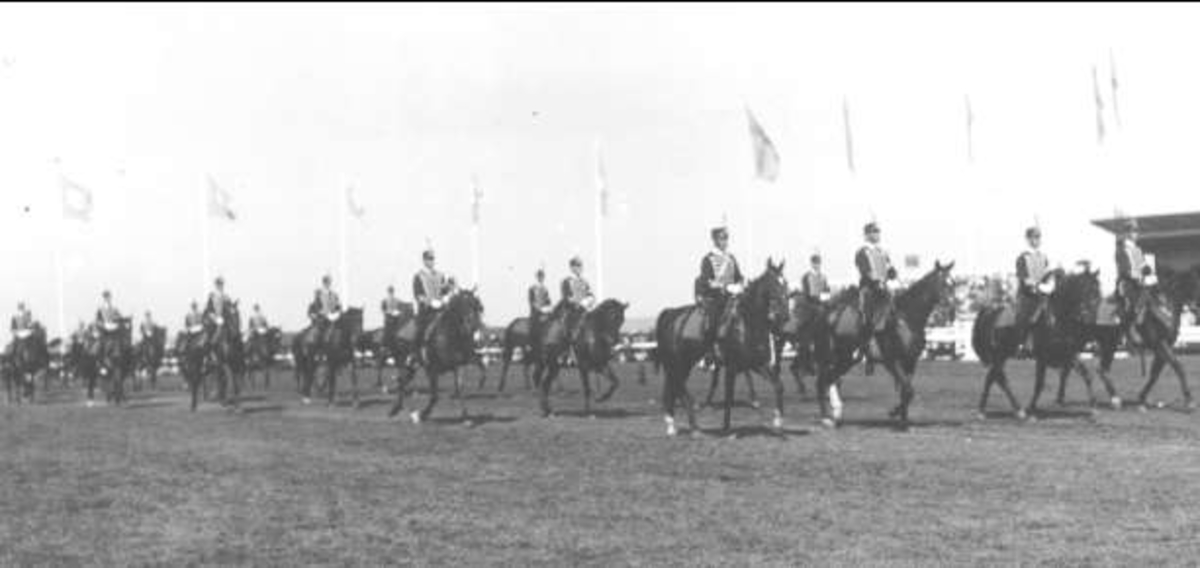 Från husarernas riduppvisning inför kronprinsparet, under lantbruksmötet på Axvall, midsommar 1935.