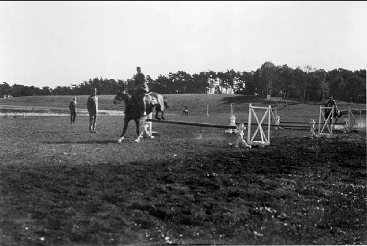 Officersaspirantskolan vid K 3 i Skövde 1929-30. "Gymnastikhoppning" öster om K 3 kasern i Skövde. Till vänster "Lusharpan"- sedemera prishoppningsbanan, i bakgrunden Dunkehallsåsen.