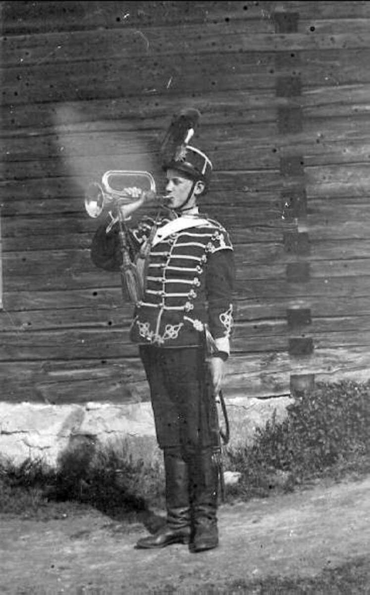 Ung trumpetare I K 3 m/ä. Pojken tillhör musikkåren vilket framgår av "svalboet" på vänster axel och röd plym i mössan. Kortet taget i Hallsberg.