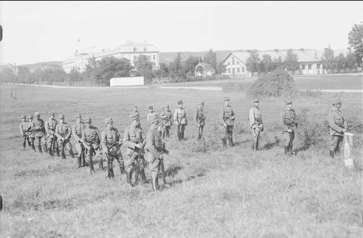 Uniform m /23 (de flesta). Uniform m/10 och mössa m/ä (de bakre i vänstra ledet. Obs! I bakgrunden musikpaviljongen till vänster om ridhuset. K 3:s dansbana låg i högra delen av syréndungen bakom vita långsmala förrådet.