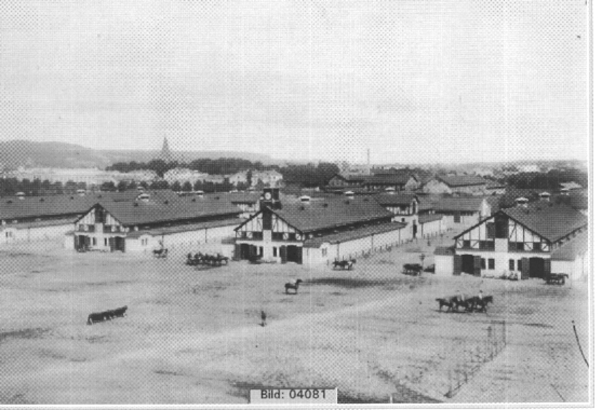 K3. Kaserngården och stallarna. Bilden tagen innan allén mellan valvet och klockstallet planterats.