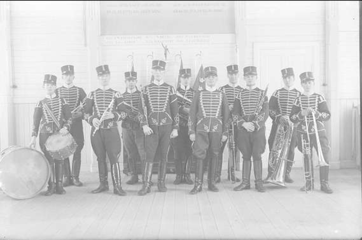 Titel: Den sista delen av K 3 musikkår som 1936 bestod av 16 musiker. Musikernas m/ä-uniformer skilde sig från övriga genom beteckningen på bägge axlarna, där fästes det så kallade "svalboet".
