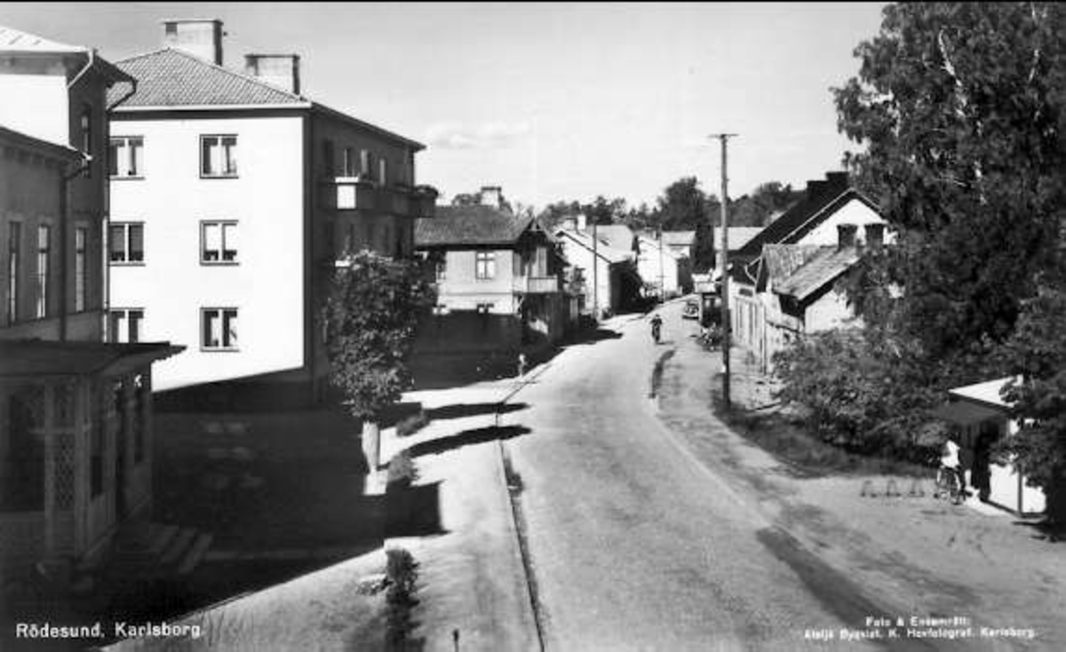 Gatubild från Rödesund, Storgatan med den gamla bebyggelsen. Här "landfiskals" huset byggt 1939. Vykort.