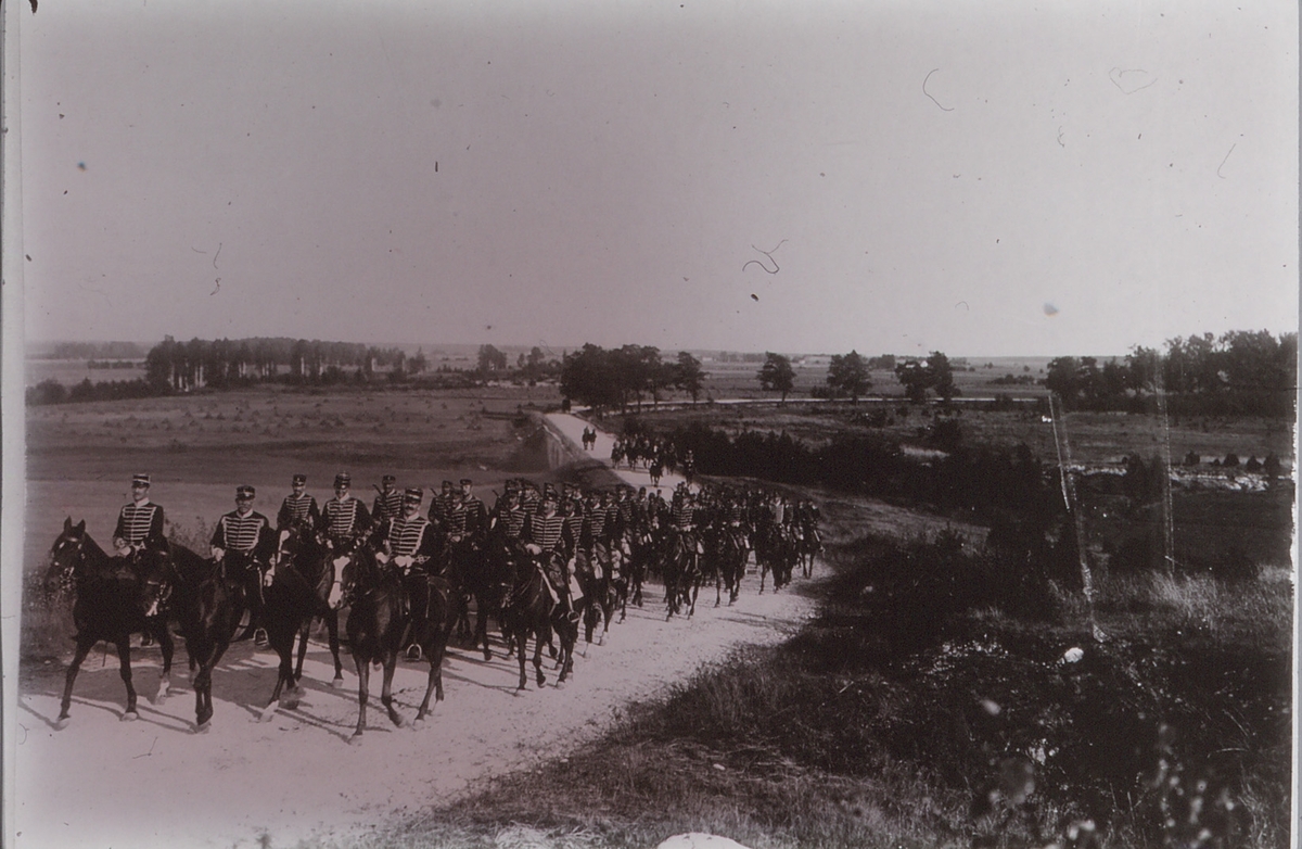 Livregementets husarer. Husarlägret på Sanna hed. Troligen 3 skvadron, Östra Nerikes skvadron på marsch mot husarlägret, övergång vid bron över Täljeån vid Näset i Mosås. Slutet 1800-tal.