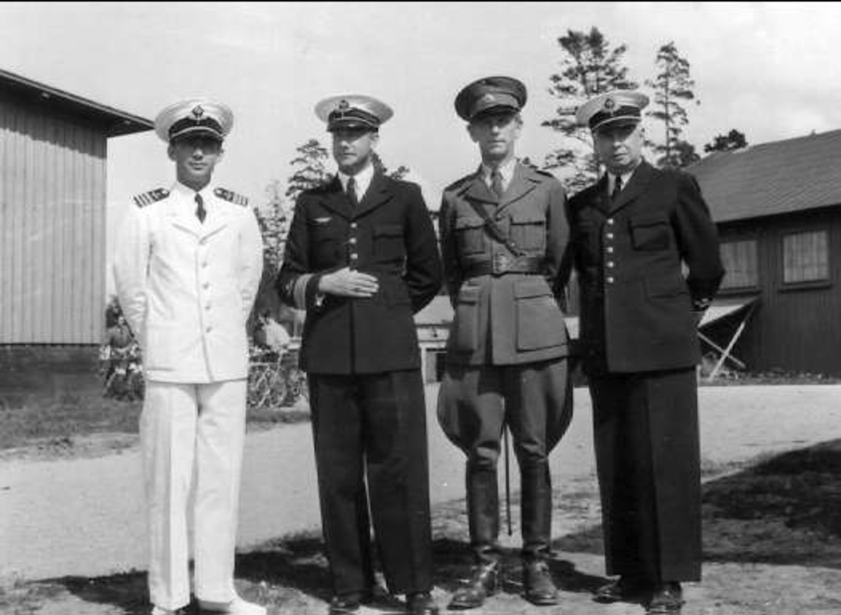 Tennisbanan och idrottsplatsen på F 6 invigs 17/6 1945. I samband med detta arrangerades eskadermästerskap i friidrott. (F 6 vann överlägset). Här ses från vänster kapten Tornlind F 6, gästande major, ryttmästare Berthold F 6 samt gästande intendent.