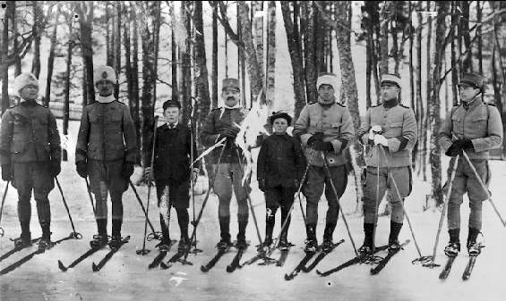 Skidutflykt ing 2 1922. Från vänster Jagart, Löfgren, Karl-Otto Forsberg, Bent Sterling, Stillert, Alm (broder till första vasloppsegraren) och även några barn. Förstoring 25 x 40 cm. Neg finns.