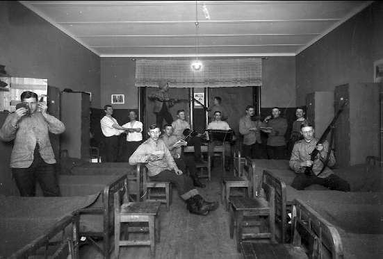 Sjukvårdare i Karlsborg omkr 1909 - 1911. Mannen med geväret är dist. Korpral Karl-Emil Scott, sjukvårdare, född i Blidsberg 1887. Förstoring 16 x 22 cm.