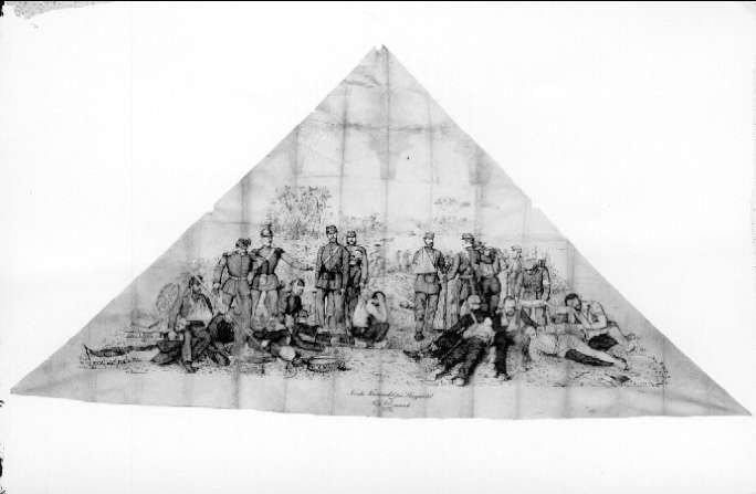 Foto ur instruktionsbok föreställande "Första hjälpen på slagfältet 1874".