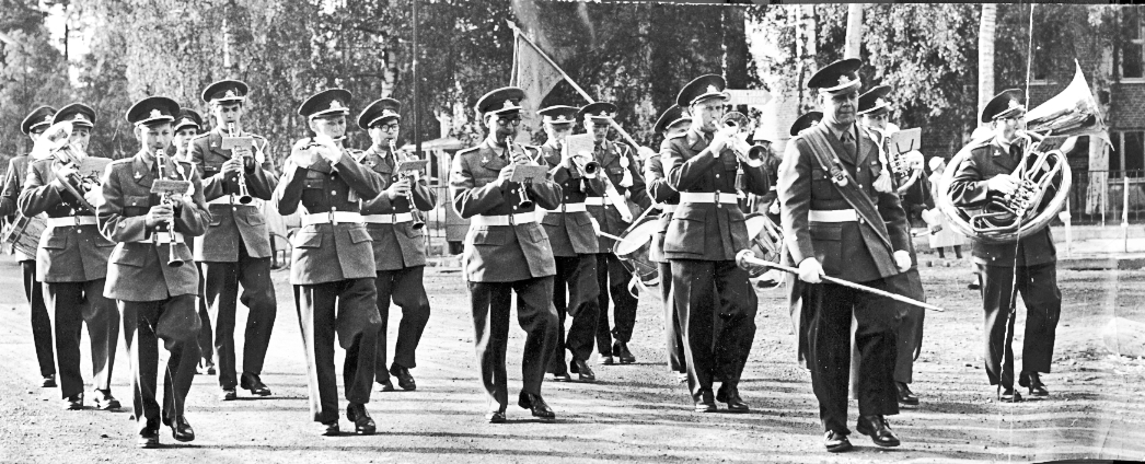LV 1:s musikkår. Drogs in 1957. Hans Jonsson, Storgatan 40, Karlsborg var då musikfurir. Bilden är en gåva av Olof Erdhage, Henrik Gjutares gata 30 B, Skövde.