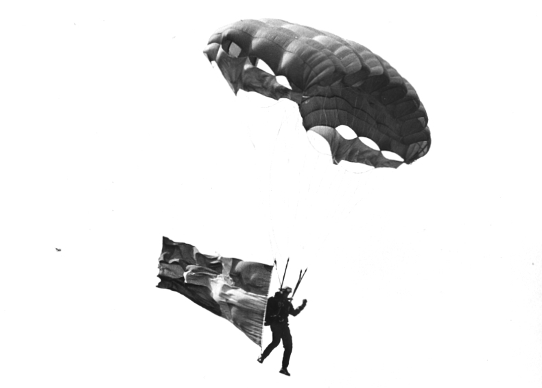 F6 Karlsborg. Fanjunkare Lidman, fallskärmsjägarskolan, fallskärmshoppar på Svenska Flaggans Dag. Landning på Molidens idrottsplan. Albumet är en del av en donation från Karl-Axel Hansson, Karlsborg. Förteckning över hela donationen finns i albumet samt som Word-dokument.