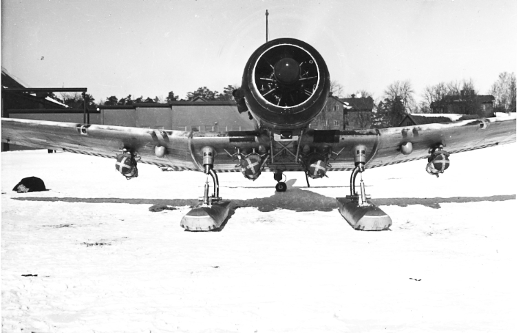 F6 Karlsborg 1942. Flygplan B5 klar för start med 4 "matbomber" hängda. 2 divisioner (18 flygplan) fällde dessa behållare över insnöade gårdar i Skåne. Albumet är en del av en donation från Karl-Axel Hansson, Karlsborg. Förteckning över hela donationen finns i albumet samt som Word-dokument.