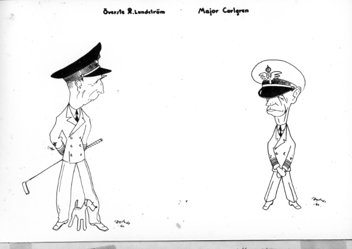 F6 Karlsborg 1940. Karikatyrtreckning av vpl.ff Agne Högstedt föreställande överste Å Lundström F6 samt major Carlgren F6. Albumet är en del av en donation från Karl-Axel Hansson, Karlsborg. Förteckning över hela donationen finns i albumet, samt som Word-dokument.