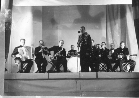 F6 Karlsborg 16/11 1940. F6 första orkester. Fest i gymnastiksalen. Albumet är en del av en donation från Karl-Axel Hansson, Karlsborg. Förteckning över hela donationen finns i albumet, samt som Word-dokument.