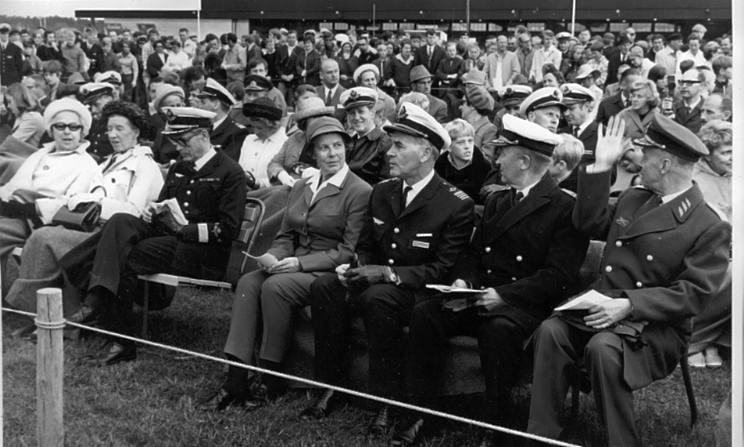 F6 Karlsborg. Flygdagen 1969. Längst fram i mitten: Från vänster: Generallöjtnant Stig Norén, fru Birgit Turing (som tilldelades Aftonbladets medalj för svensk flygargärning), chefen F6 N.O. Hansson. Albumet är en del av en donation från Karl-Axel Hansson, Karlsborg. Förteckning över hela donationen finns i albumet samt som Word-dokument.