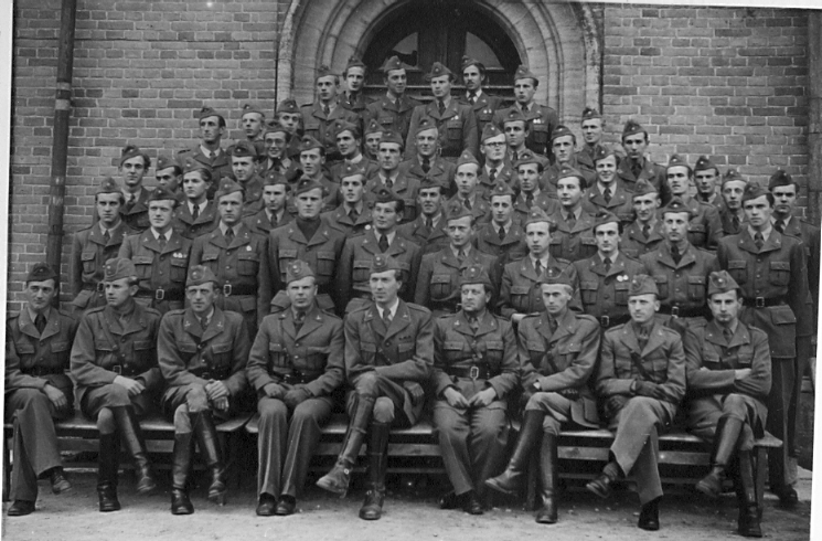 LV1 Karlsborg. Troppchefsskolan 1947. Främre raden fr. vänster: Överkurir Toje Kvarforth, sergeant Daniel Danielsson, löjtnant Börje Södergård, skolchefen kapten Uno Engström, styckjunkare Folke Rosén, sergeant Börje Ekfalck, sergeant Tage Södergren, löjtnant Sture Hansson. Albumet är en gåva från Tage Södergren.