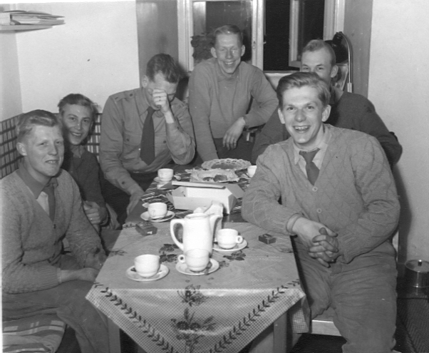LV1 Karlsborg. Troppchefsskola 1954-1955. Eleverna Landström, Andersson, Wikström, Pettersson, Silverfeldt och Örman på Soldathemmet. Albumet är en gåva från förvaltare Tage Södergren.