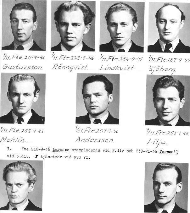 F6 Karlsborg 1949. Från vänster: och uppifrån: Flygteknikerna 211-9-46 Gustavsson, 223-9-46 Rönnqvist, 254-9-45 Lindkvist, 187-9-47 Sjöberg, 255-9-45 Mohlin, 207-9-46 Andersson, 253-9-45 Lilja, 216-9-46 Larsson, 239-21-36 Fermwall. Albumet är en del av en donation från Karl-Axel Hansson, Karlsborg. Förteckning över hela donationen finns i albumet samt som Word-dokument.