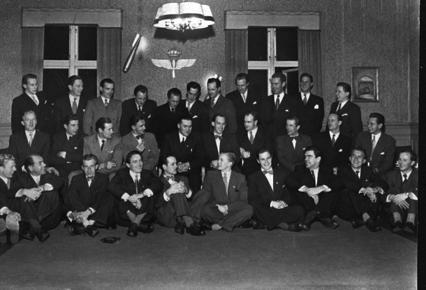 F6 Karlsborg 1949. 39:orna 10-årsjubilerar på underofficersmässen. Namnlista finns i albumet samt som Word-dokument. Albumet är en del av en donation från Karl-Axel Hansson, Karlsborg. Förteckning över hela donationen finns i albumet samt som Word-dokument.