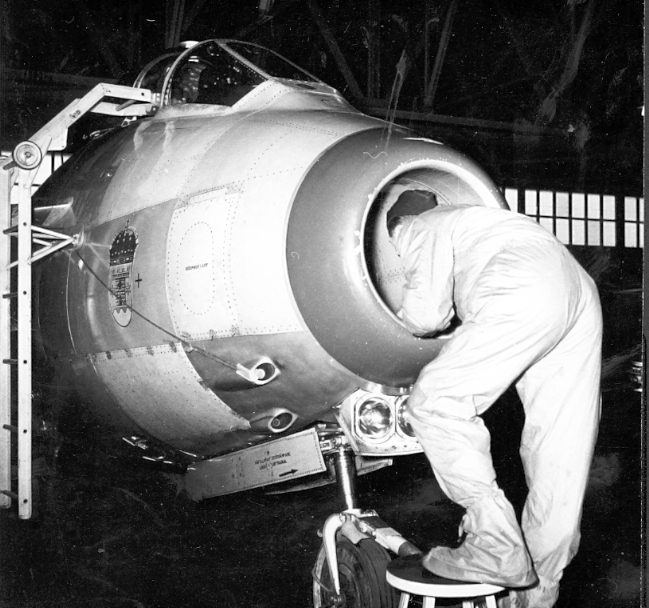 F6 Karlsborg 1953. Flottiljen omskolas till flygplan A29 "Tunnan". Flygtekniker Allan Andersson med skyddsoverall och tofflor kryper in i luftintaget. Albumet är en del av en donation från Karl-Axel Hansson, Karlsborg. Förteckning över hela donationen finns i albumet samt som Word-dokument.